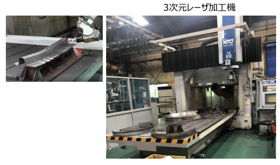 レーザ加工機は、三次元5軸加工機を中心に、自社でプレス加工した製品の3次元形状切断に使用しており、プレスパネルをご支給いただいたものを要求通りに切断する受託加工も承ります。