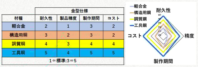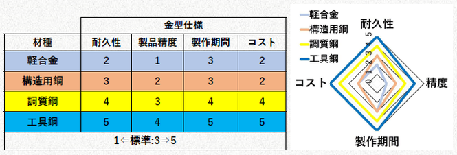 試作型を製作する際は、用途に応じた最適な金型材料を選定します。製品の用途や製品完成までの期間、ご予算などに合わせた金型作りに対応しています。